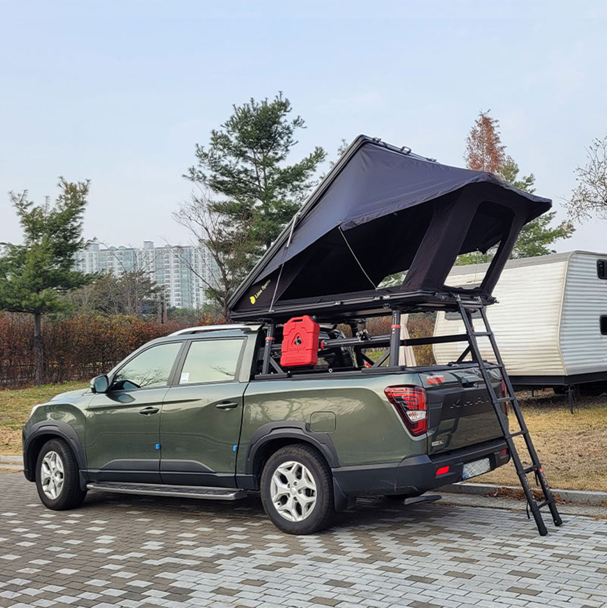 従来のルーフテントは「寝る」ことに特化したシンプルな設計でしたが、本モデルは日よけタープを搭載し、「くつろぐ」空間まで実現。